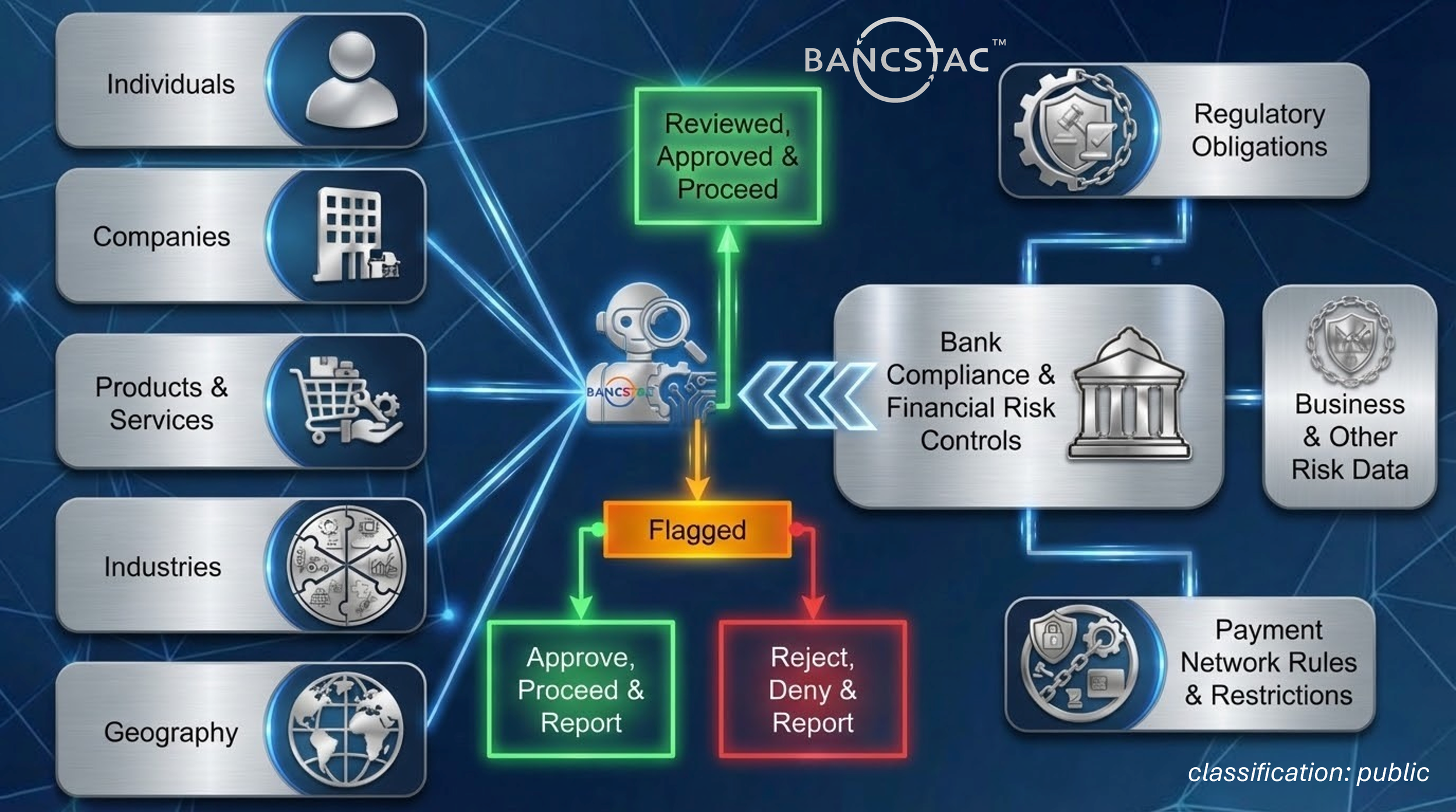 Bancstac provides the machine learning engine to analyze historic bank data and the artificial intelligence decision manager to predict, identify and actively deny fraud and compliance breaches. Fully autonomous, semi-autonomous (human in the loop), and manual modes (flag to a human for action) can be applied to individuals, companies, entire industries, specific transactions, specific channels and devices; rules based restrictions for payment network mandates and bank compliance.