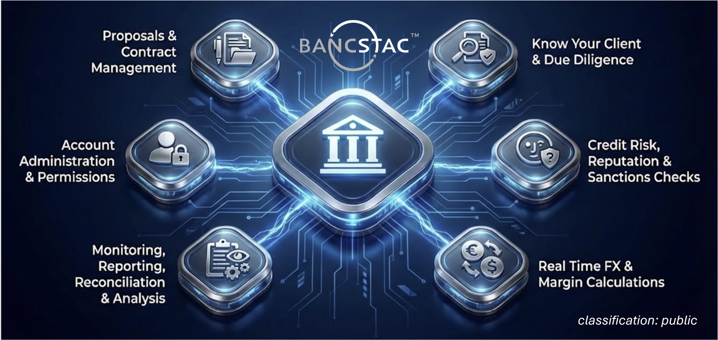 Bancstac provides the technology infrastructure and merchant management system enabling banks to communicate proposals and manage contracts; conduct client due diligence, risk and applicable sanctions checks; administer and monitor accounts and set permissions; calculate and reconcile various payment network and bank fees; and generate analyisis and merchant statements.