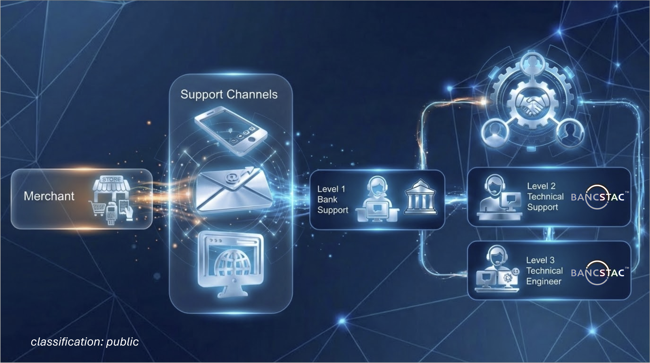 Bancstac provides the technology infrastructure and system enabling banks to receive support requests from merchants, manage transactions issues, assess any system issues, obtain suggested technical solutions from our database. If a bank representative is unable to resolve a technology related support ticket, they can escalate to Bancstac level 2 technical support. If the technical issue requires a system level change, Bancstac level 2 can internally escalate the issue to Bancstac level 3 technical engineering teams.
