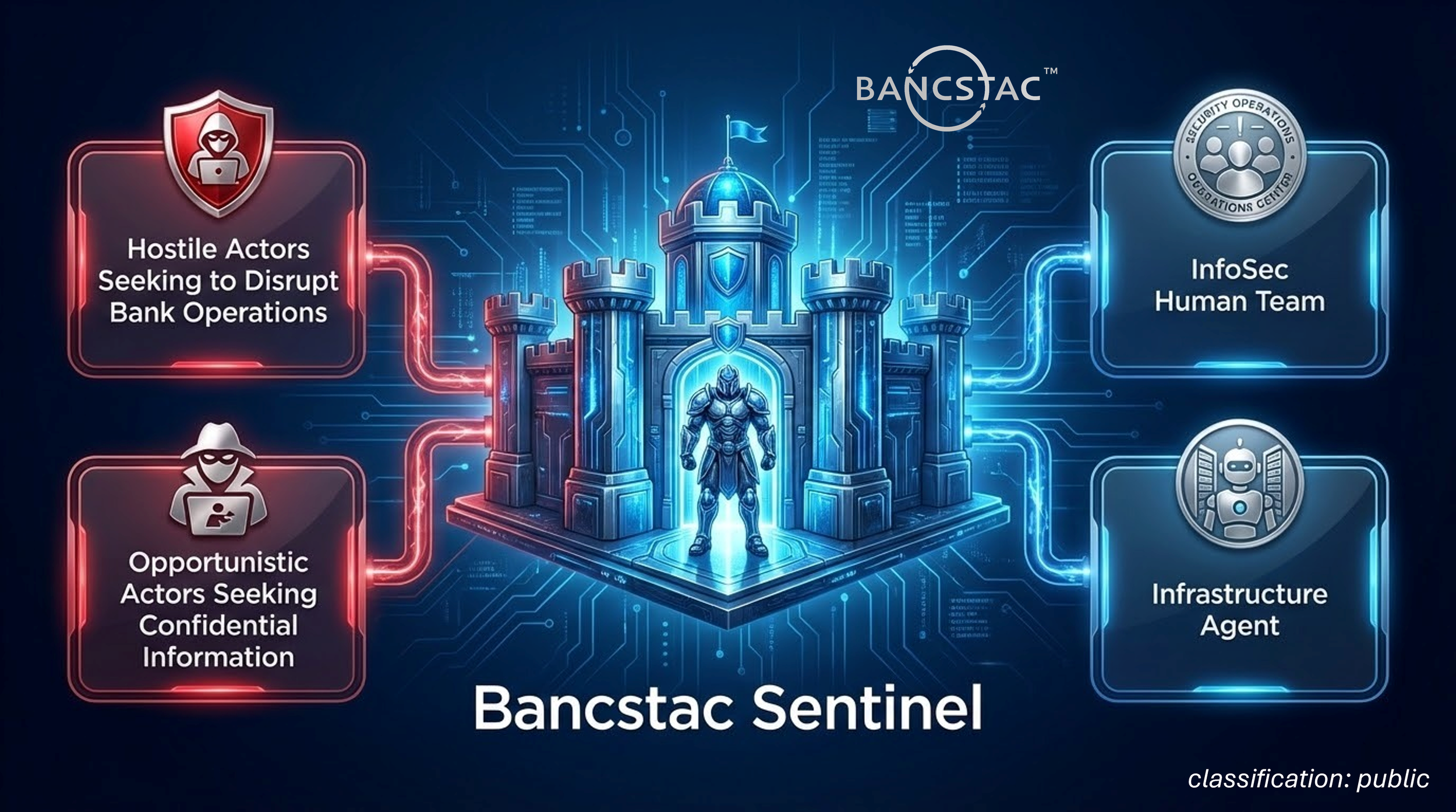 Bancstac provides the technology infrastructure and defensive capabilities enabling banks to monitor, analyze, block, log, and report hostile network activity. Bancstac sentinel communicates with our infrastructure agents which dynamically allocates compute resources to ensure bank infrastructure automatically scales as needed providing banks with high-availability and system stability.